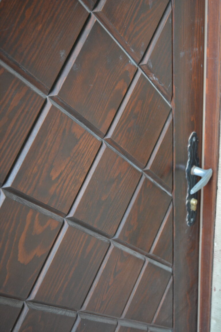 Drzwi wykonane z drewna sosnowego we wzorze zatwierdzonym przez konserwatora zabytków. Całość pokryta farbami do drzwi zewnętrznych w brązowym odcieniu oraz wyposażone w kute klamki oraz ozdoby.