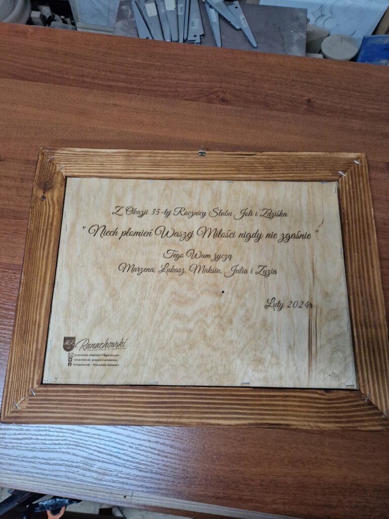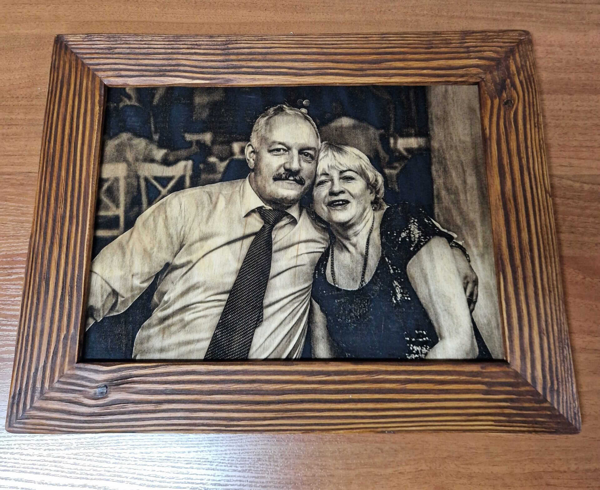 Zdjęcie wygrawerowane na sklejce 6mm. Z drugiej strony grawerowana dedykacja. Dodatkowo zostało umieszczone we wcześniej wykonanej przez nas ramie z drewna sosnowego; rama szczotkowana oraz olejowana pod kolor. Zdjęcie zakonserwowane bezbarwnym olejem do drewna.
