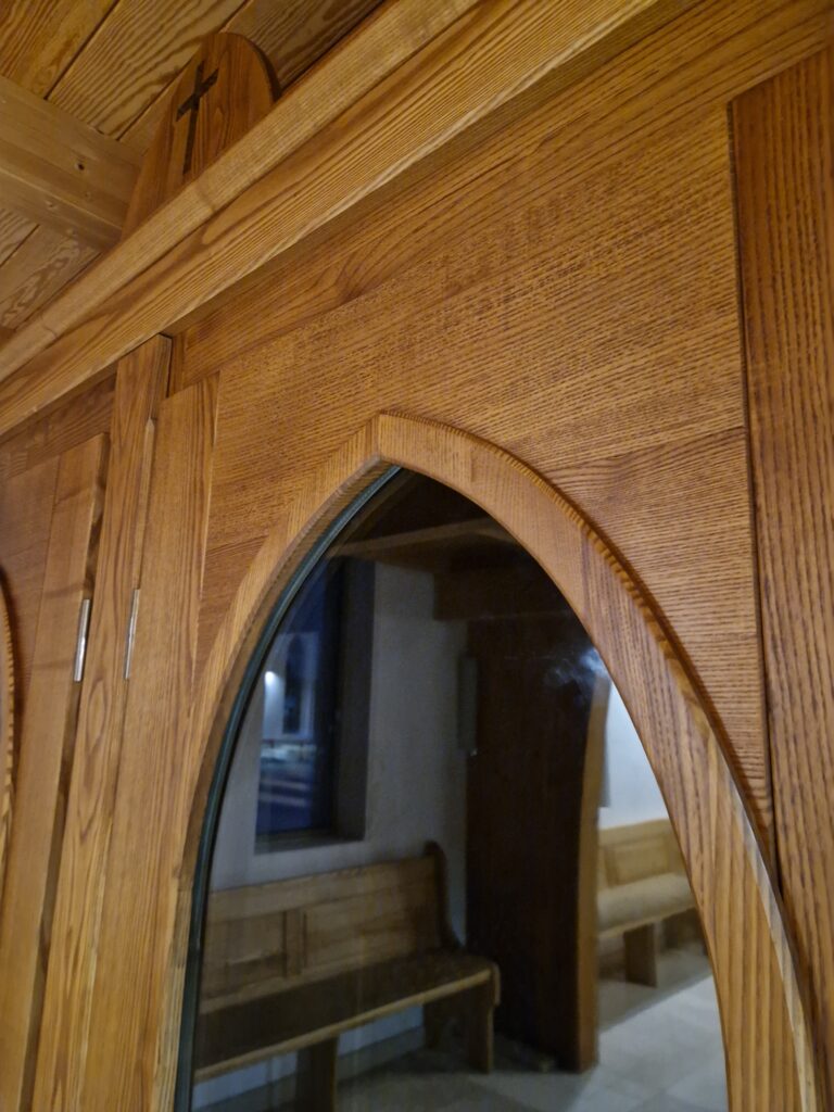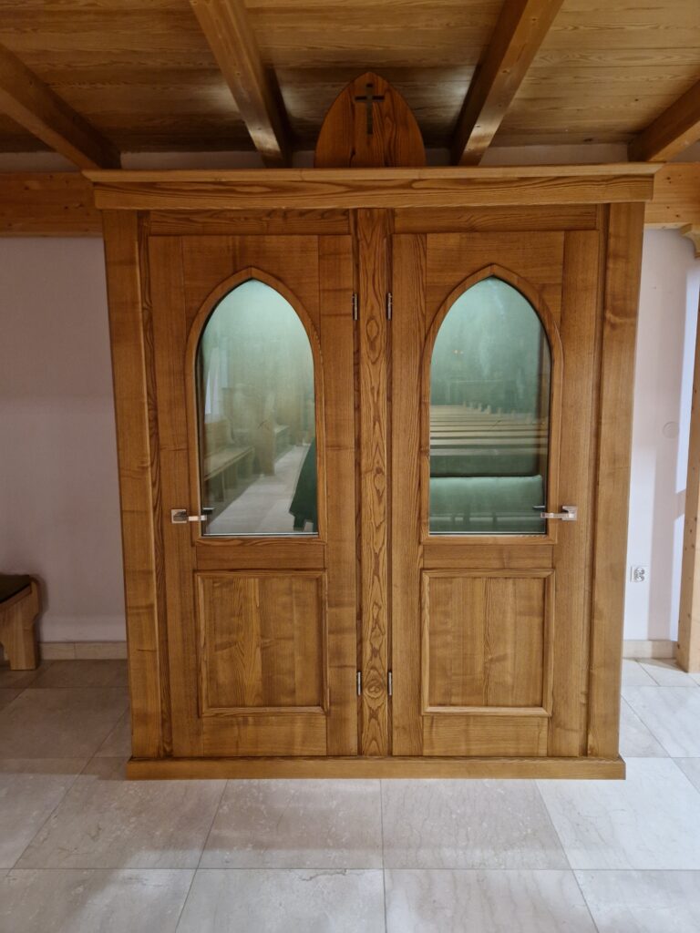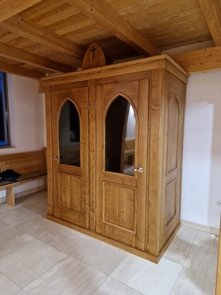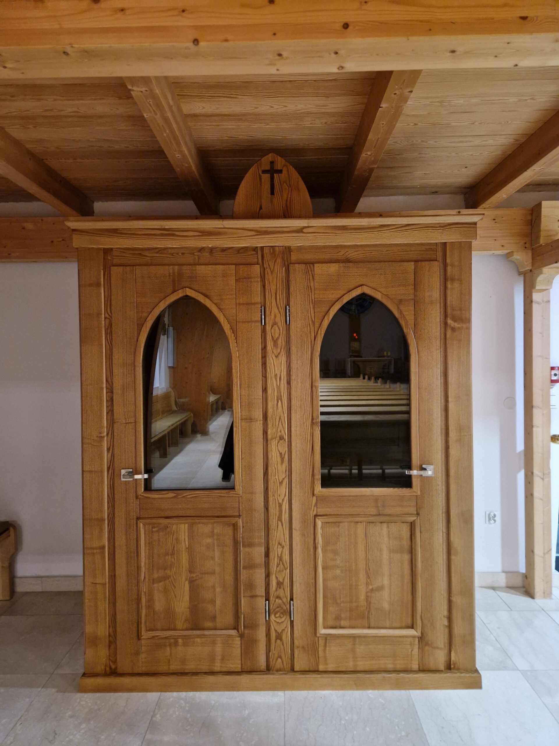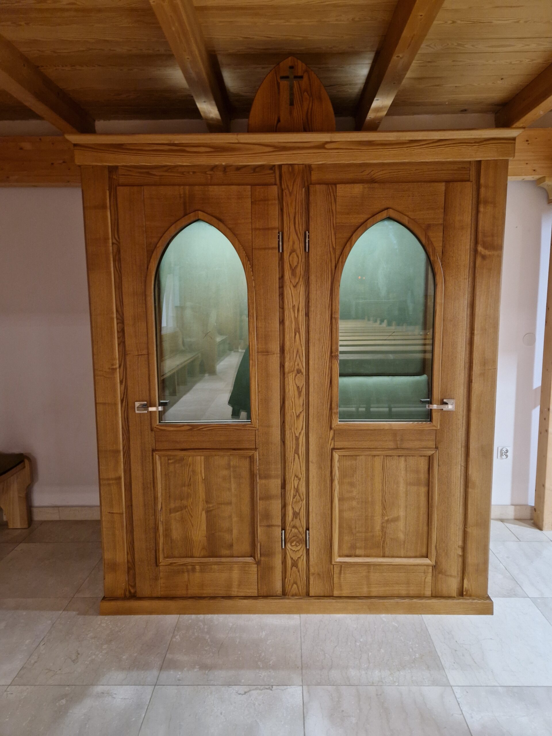 Konfesjonał zamykany w kościele NMP z Lourdes w Otominie. Wykonany z drewna jesionowego; bejcowany i wykończony lakierem matowym. Motyw przewodni konfesjonału w postaci łuków nawiązuje do ogólnie przyjętego stylu panującego w tym kościele. Wnętrze zostało dodatkowo wygłuszone panelami tapicerowanymi na ścianach oraz pianką akustyczną na suficie. Szyby w drzwiach przyciemniane z lekkim efektem lustra weneckiego, wykonane w technologii zespolonej z metalową listwą pomiędzy taflami szkła, co zwiększa dźwiękoszczelność konfesjonału.