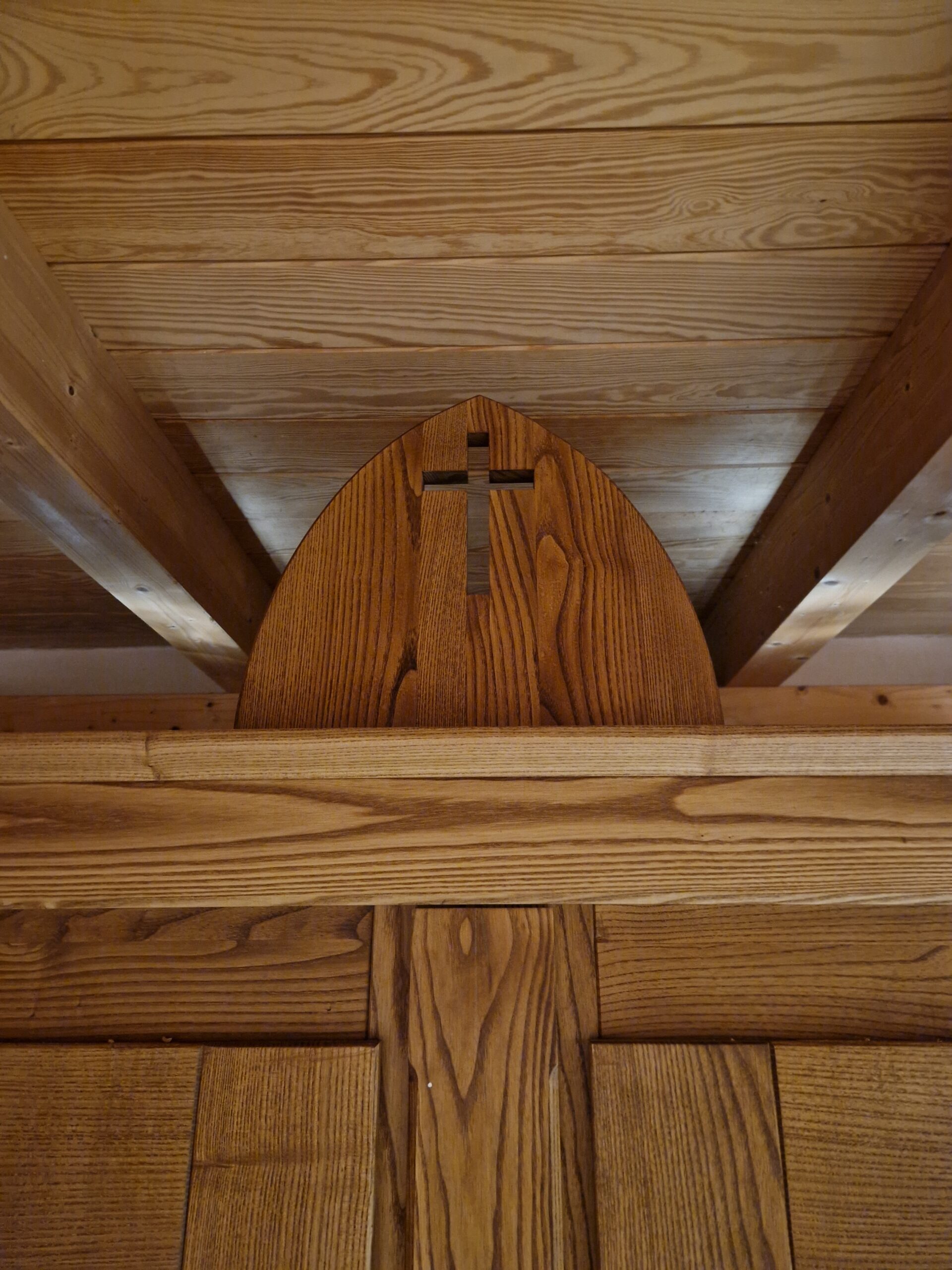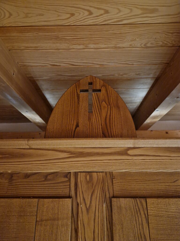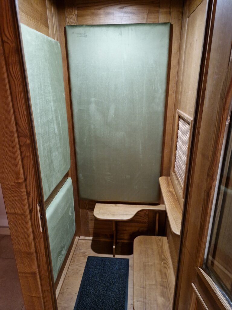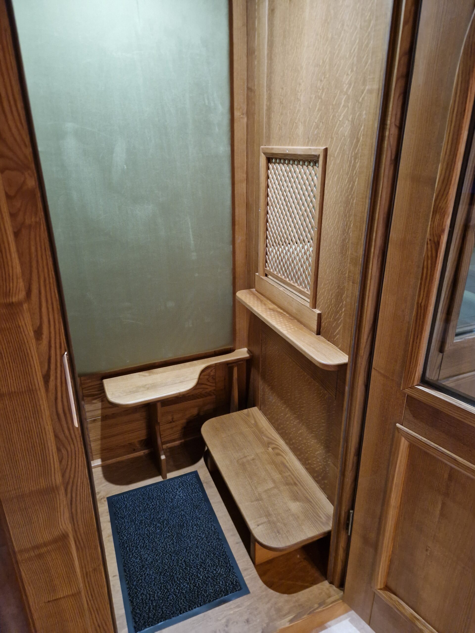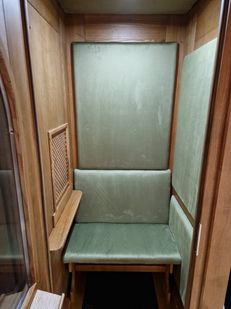 Konfesjonał zamykany w kościele NMP z Lourdes w Otominie. Wykonany z drewna jesionowego; bejcowany i wykończony lakierem matowym. Motyw przewodni konfesjonału w postaci łuków nawiązuje do ogólnie przyjętego stylu panującego w tym kościele. Wnętrze zostało dodatkowo wygłuszone panelami tapicerowanymi na ścianach oraz pianką akustyczną na suficie. Szyby w drzwiach przyciemniane z lekkim efektem lustra weneckiego, wykonane w technologii zespolonej z metalową listwą pomiędzy taflami szkła, co zwiększa dźwiękoszczelność konfesjonału.